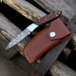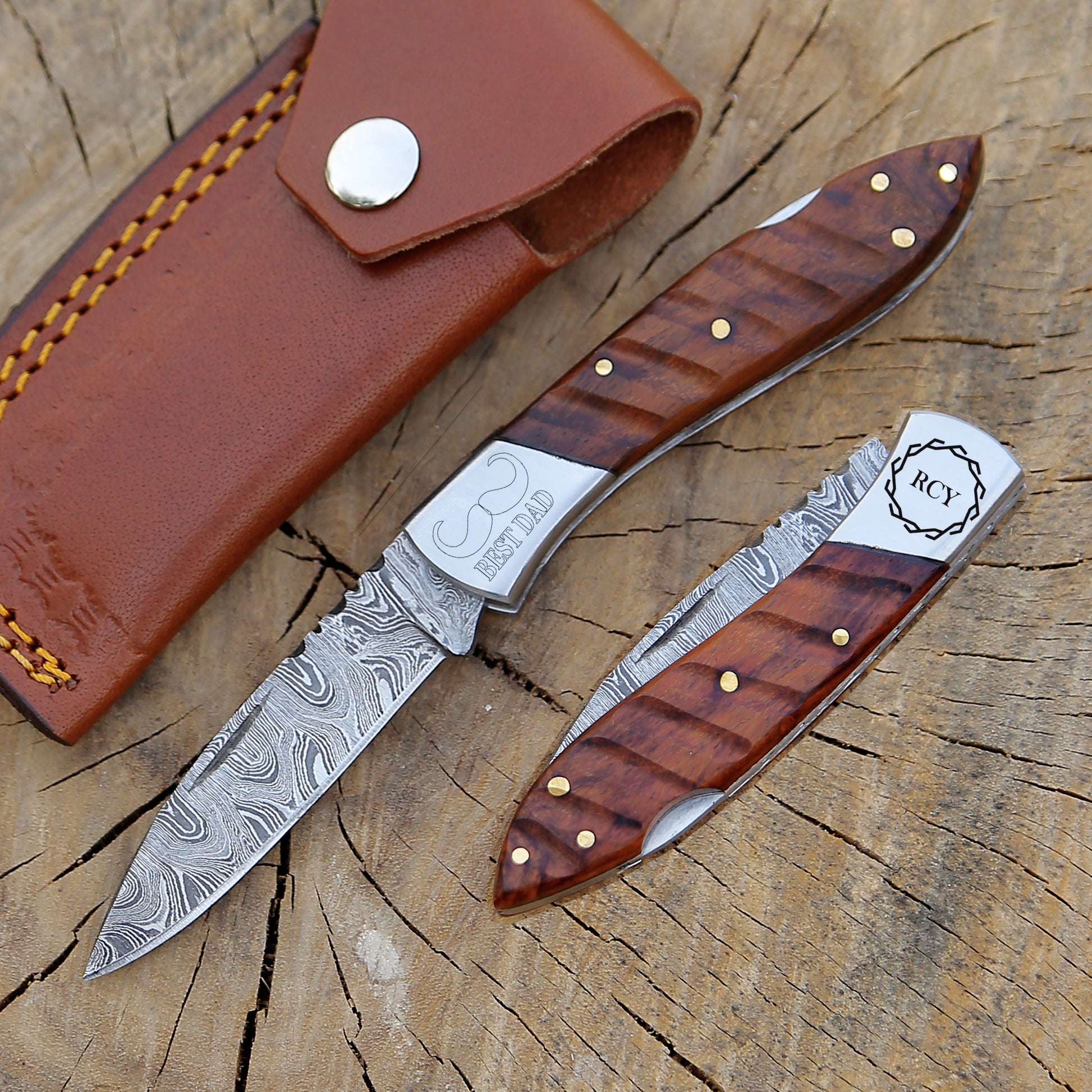 Custom Engraved Damascus Steel Folding Knife | Handmade Pocket Knife with Rose Wood Handle & Leather Sheath | Personalized Gift for Men, Dad & Outdoor Use