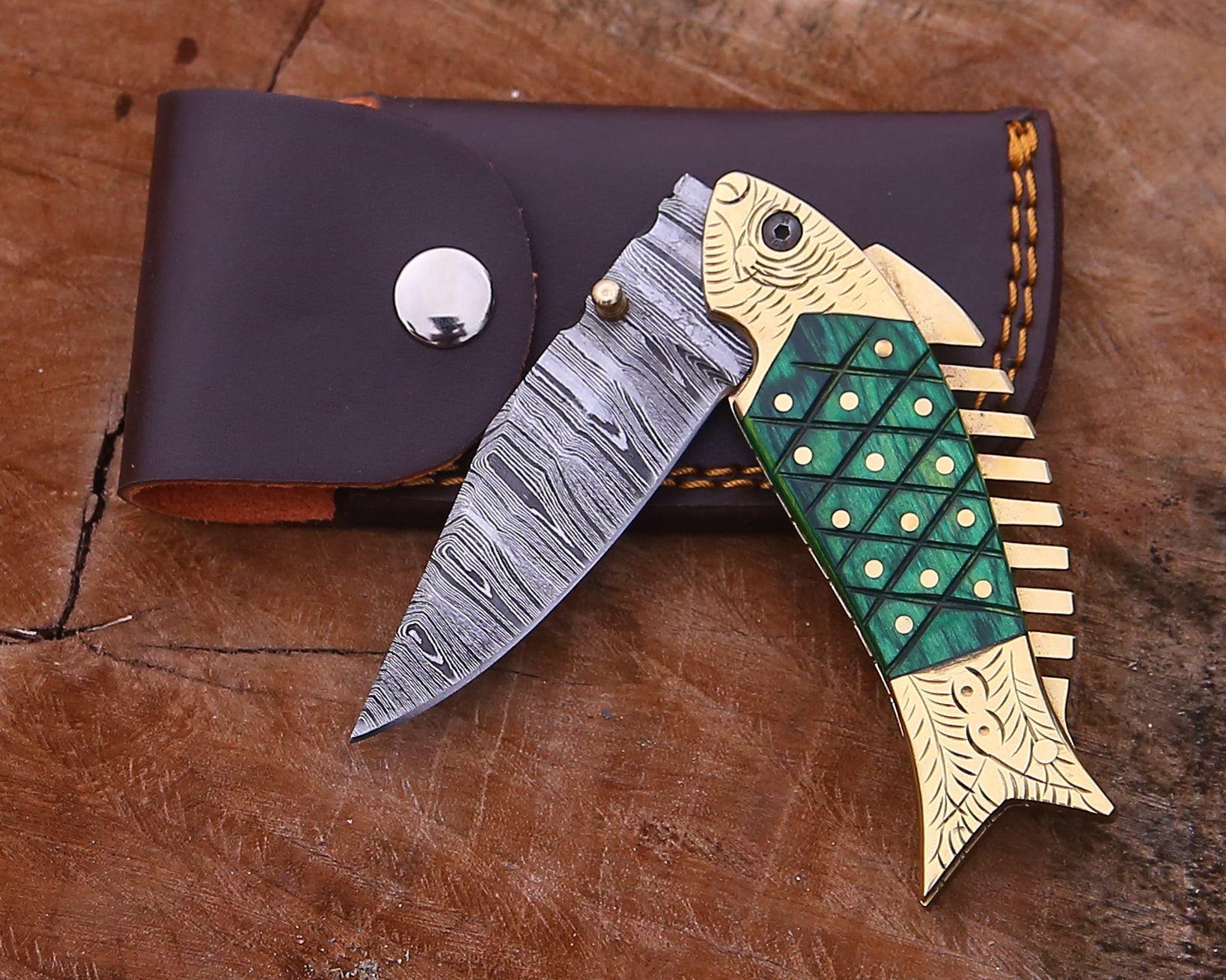 Handmade Damascus Steel Fish Pocket Knife Camping Hunting EDC Knife with Leather Sheath.