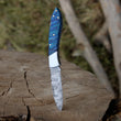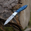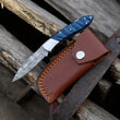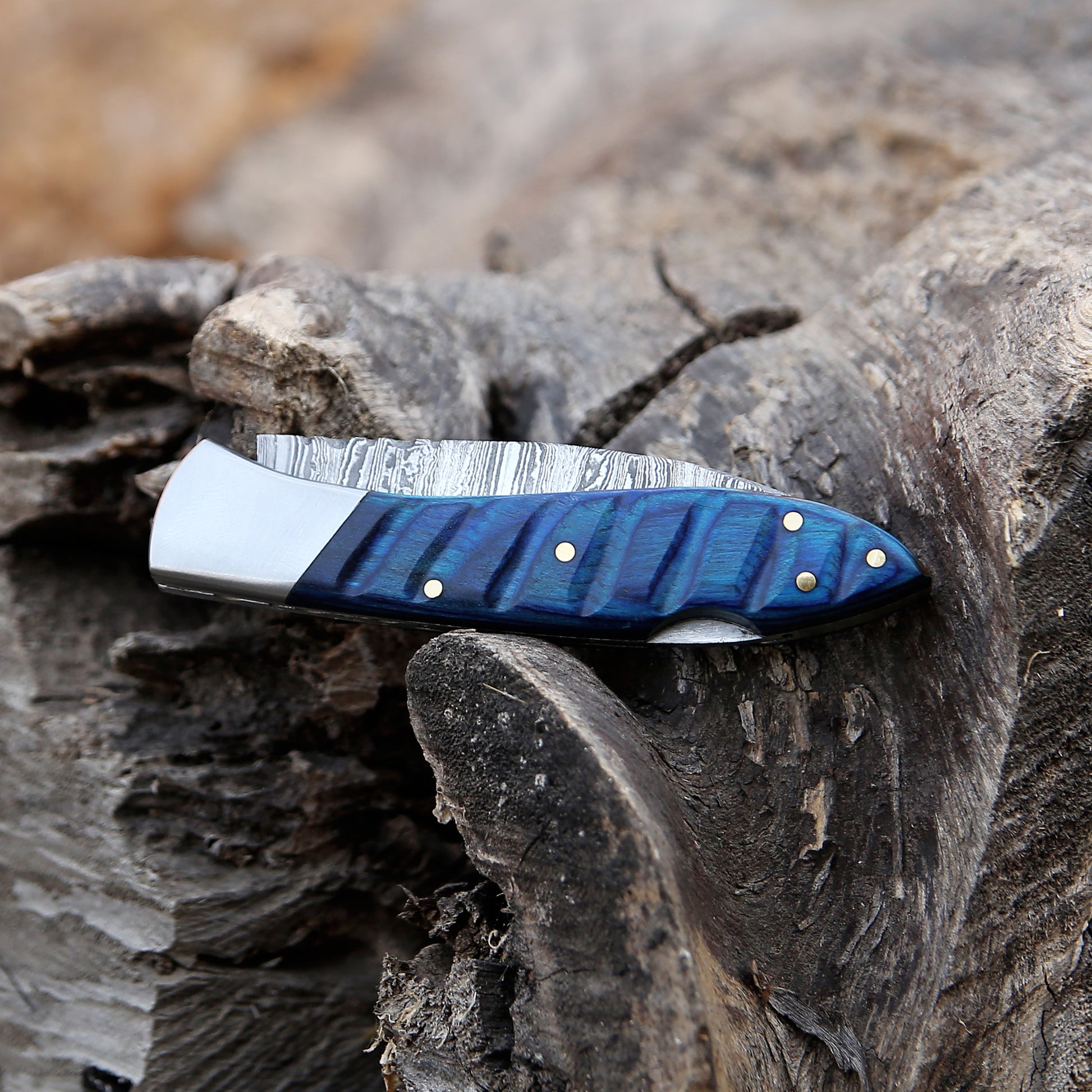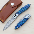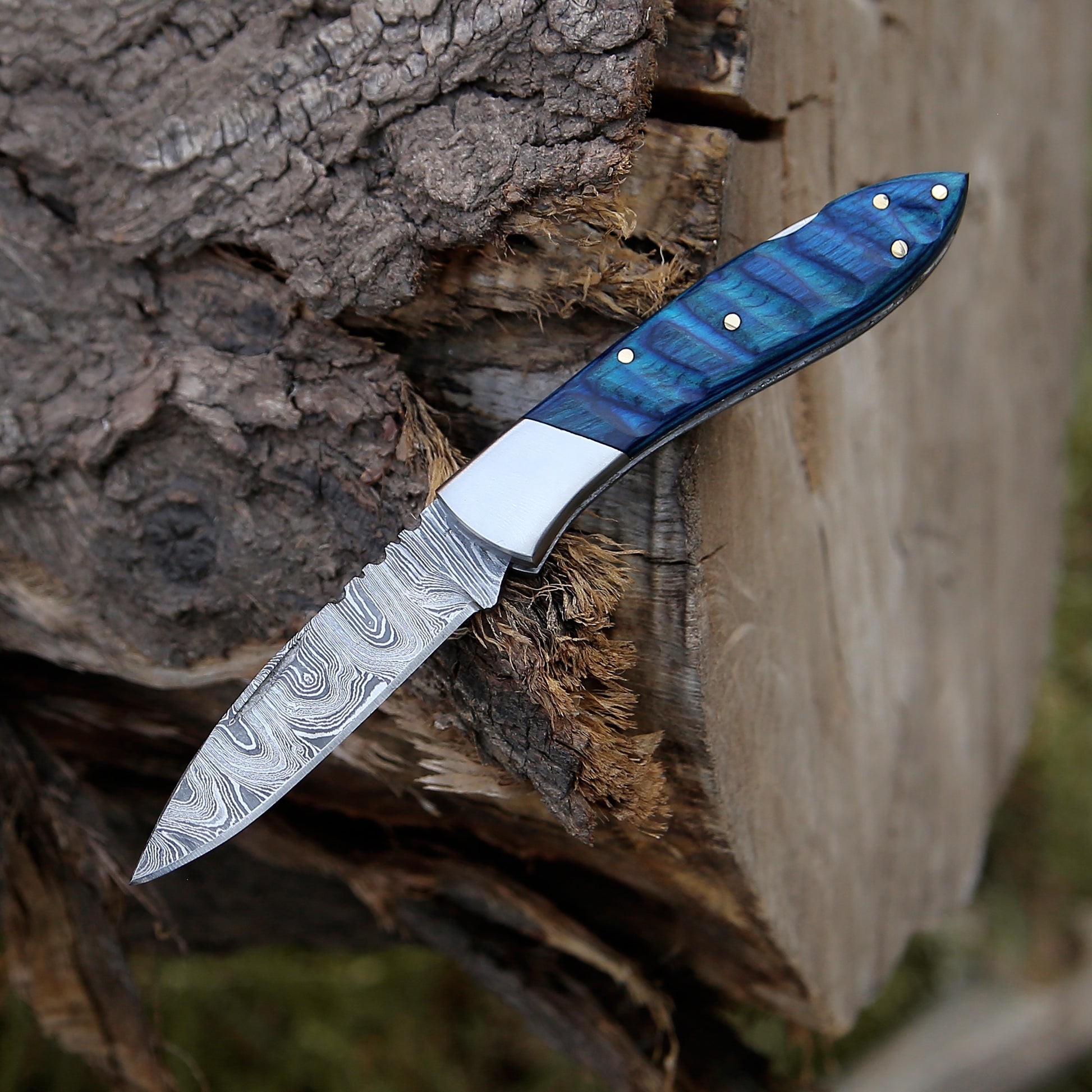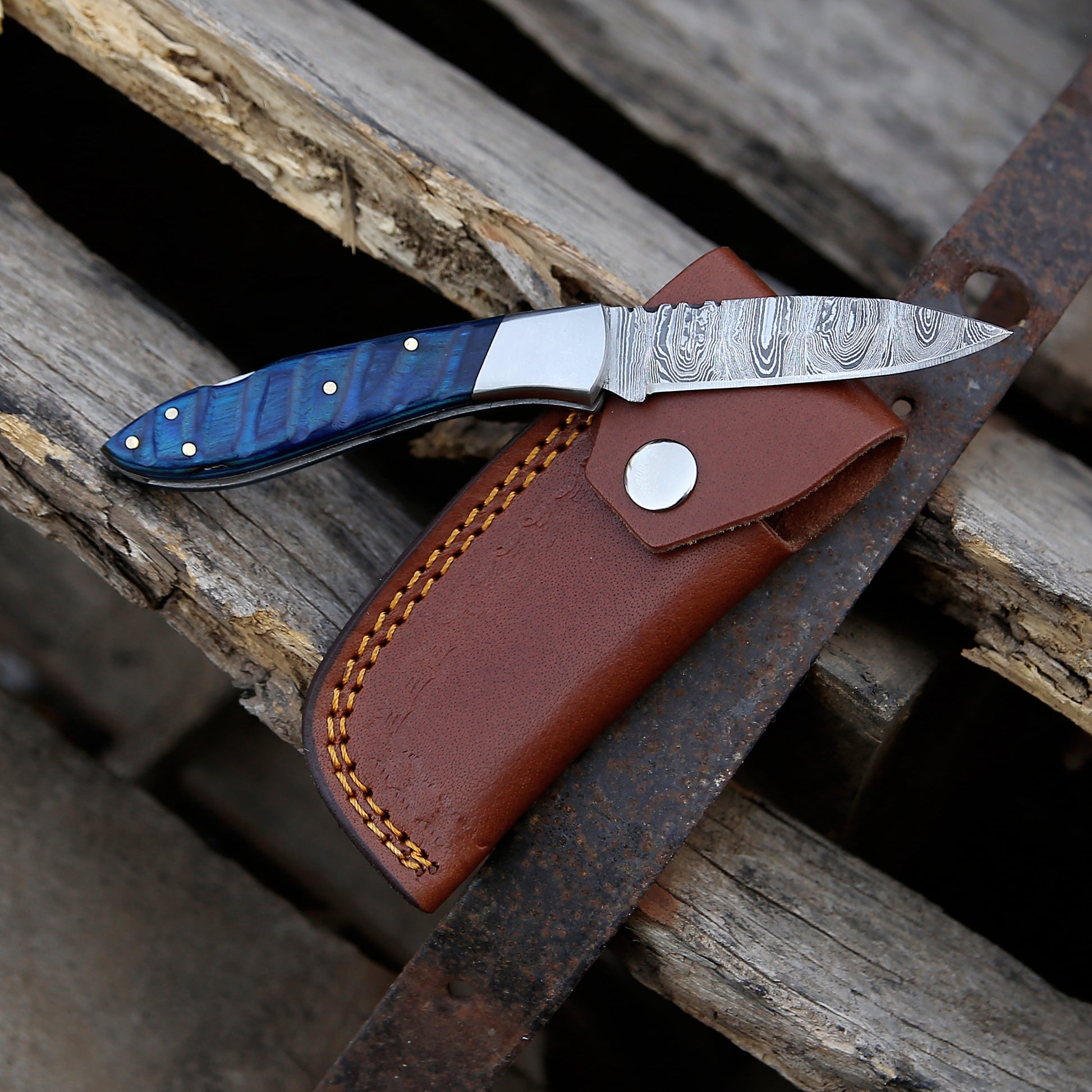 Customized Damascus steel Pocket Knife with Blue wood Handle Hunting , EDC Skinner Knife with Pouch.
