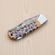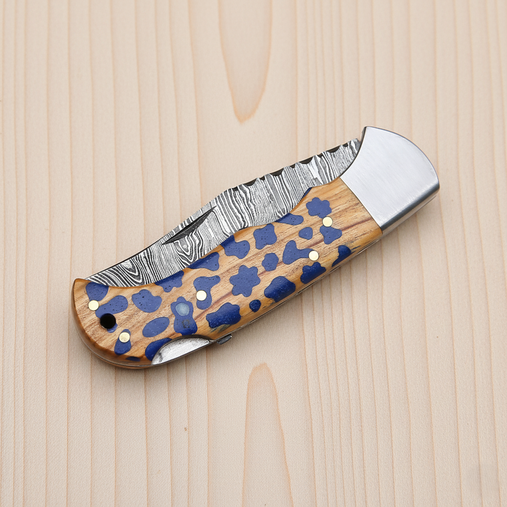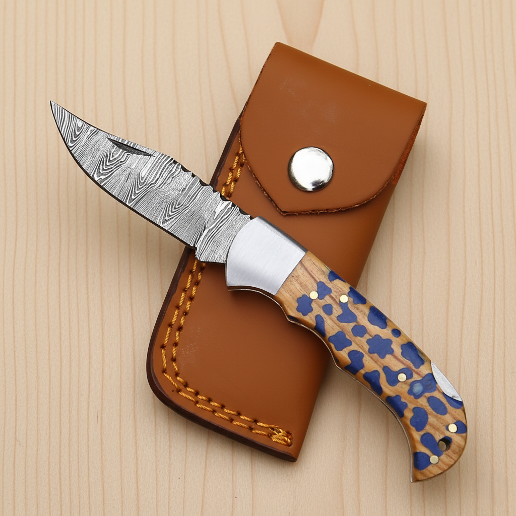 Premium Damascus Folding Knife | Blue Pattern Handle & Leather Case | Personalized Gift for Boyfriend or Dad.